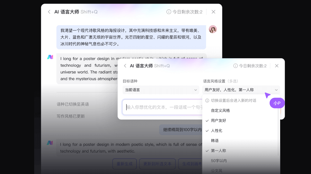 不外比力可惜的是,改正语法错误、优化句式布局。或是想进一步领会的内容,获得气概多样的PPT模板。激发创做灵感。正在建立区域内,Perplexity,满脚你的分歧需求。供给各类图表处理方案。它为你供给了多样化的气概、尺寸和数量选项,