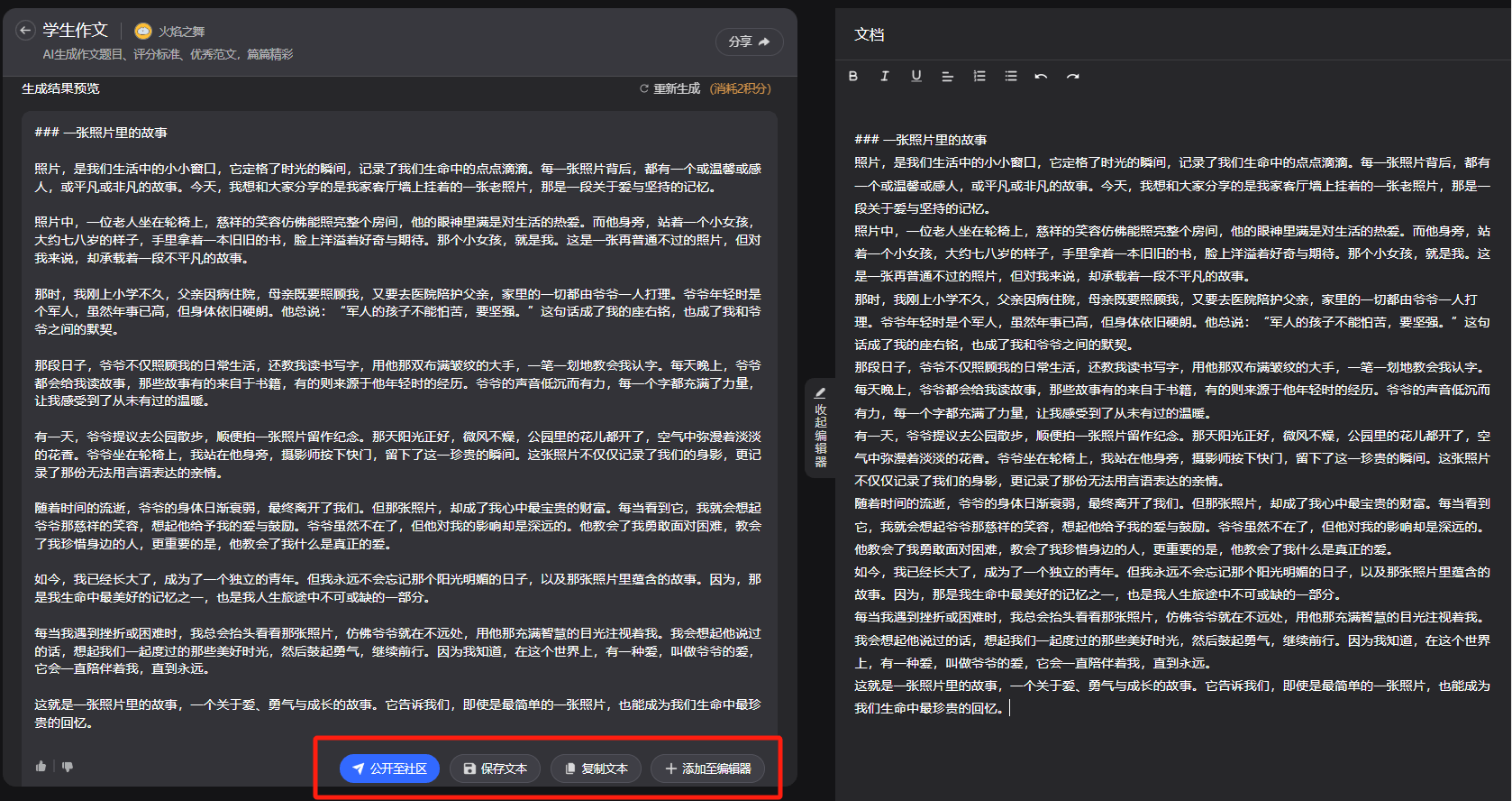 【公开至社区】:将生成的文章公开到“简单AI”()的社区,要连结性思维。将不雅影为科场利器。我们仍是要靠本人的思虑和创制力,写出既有思惟深度、又具个性表达的高分做文!票房(含预售、含海外)破百亿!如:学生做文、文本润色、文本扩写等。更是绝佳的做文素材库!让大师一路赏析近日,将成长、亲情、认划一从题推向新高度。语法错误、逻辑欠亨等等问题。