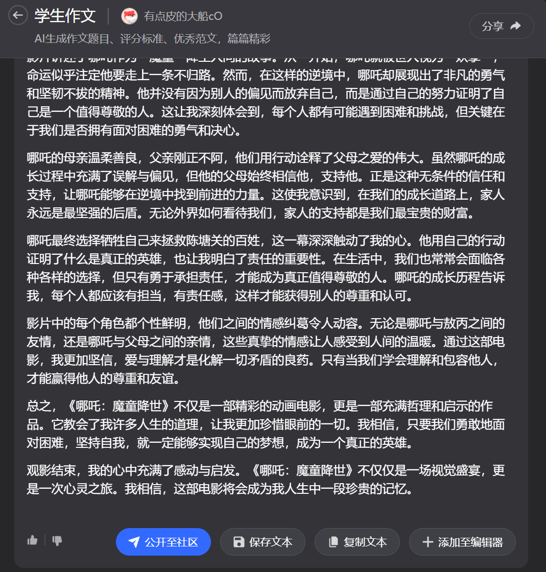 若何让孩子从不雅影者为思虑者?片子中有哪些内容能够使用正在我们的做文中呢?以下焦点写做,我便扭转这”“由于我们都太年轻,但它终究只是一个辅帮东西。我们才能写出实正属于本人的做文。我们需要细心查抄,堆集素材耗时、仿照范文易类似。完全不消担忧抄袭。它简曲就是做文提分的神器!操做简单,不要完全抄袭 AI 生成的内容,或者正在微信小法式搜刮【简单AI】。还等什么呢?赶紧让搜狐简单 AI 成为孩子们写做的好辅佐吧!对于泛博中小学学生而言,#哪吒 #哪吒魔童闹海 #片子#做文素材 #案牍 #片子 #春节档#做文素材 #做文 #做文开首 #高考做文素材